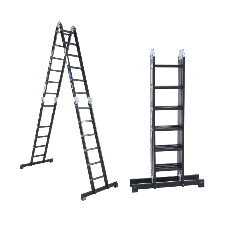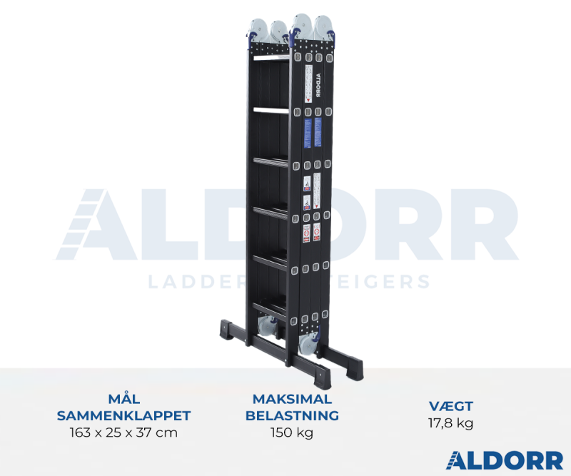 ALDORR Professional foldestige er den ideelle stige til forskellige opgaver og består af 4 sektioner med 6 trin. Takket være den lette aluminiumskonstruktion af høj kvalitet bliver ethvert job sikkert og nemt. Den alsidige stige kan bruges på to måder; både i lodret position og i foldet position (A-position) som vist på billederne. Den brede stabiliseringsstang giver ekstra greb og komfort, mens du bruger stigen, og trinene har skridsikker slidbane for ekstra stabilitet.
