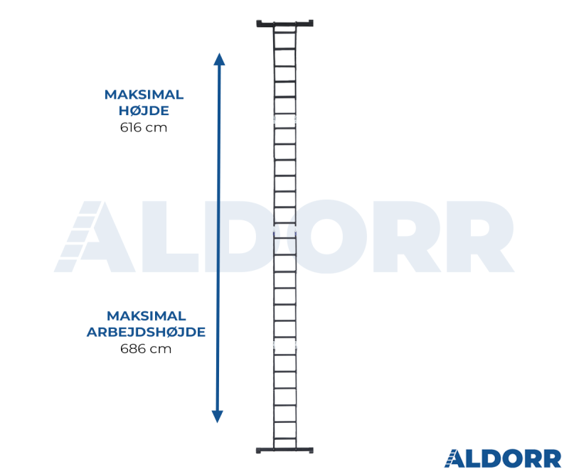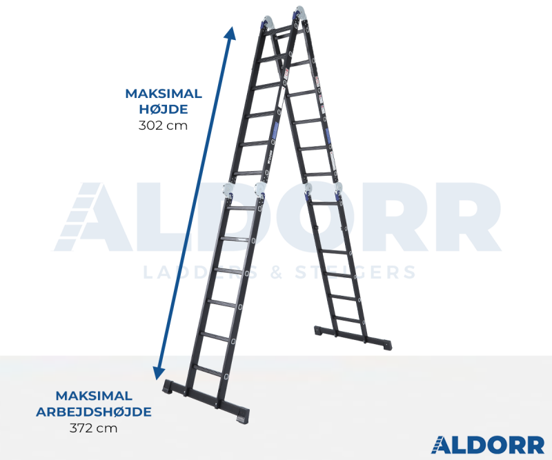 ALDORR Professional foldestige er den ideelle stige til forskellige opgaver og består af 4 sektioner med 6 trin. Takket være den lette aluminiumskonstruktion af høj kvalitet bliver ethvert job sikkert og nemt. Den alsidige stige kan bruges på to måder; både i lodret position og i foldet position (A-position) som vist på billederne. Den brede stabiliseringsstang giver ekstra greb og komfort, mens du bruger stigen, og trinene har skridsikker slidbane for ekstra stabilitet. Platformene er IKKE inkluderet. Leder du efter en foldestige med platforme? Se Foldestige 4 x 5 trin. De vigtigste specifikationer for stigen Arbejdshøjde i lodret position: 690…