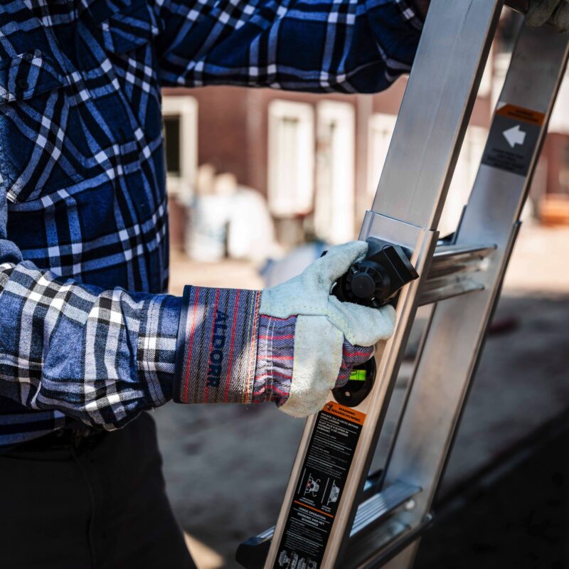ALDORR-stigen er udstyret med et integreret vaterpas, så du nemt kan kontrollere, om stigen står lige og stabilt, før du begynder at arbejde. På den måde er du sikker på, at stigen står sikkert og korrekt.